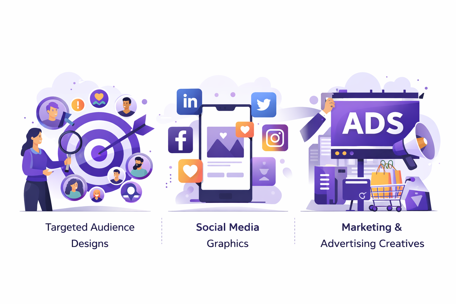 Our graphic design services help businesses build a memorable visual identity. From social media creatives to brand identity materials, we craft designs that capture attention and communicate your brand story effectively. We focus on creating visually engaging designs that align with your brand voice and marketing strategy. Whether you need digital graphics, marketing materials, or promotional designs, our team ensures every element reflects professionalism and creativity.